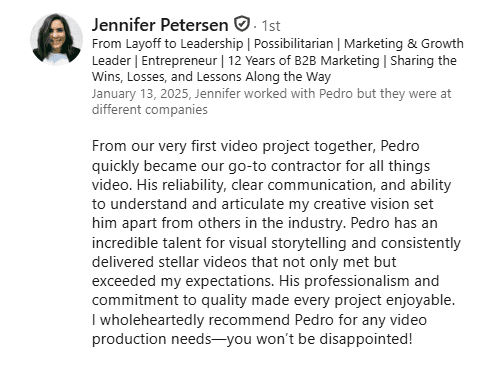 "From day one, Pedro really embraced our vision and it really felt like he was a part of our team. He helped us shape the story, refine the copy, guide the voiceover, just went above and beyond at every step."